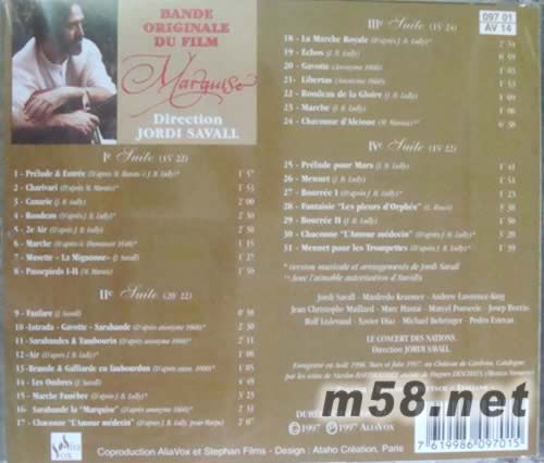 Marquise路易十四的情婦 瑪姬絲 電影原聲(m58.net) 電影原聲帶<瑪姬絲>(又名:<路易十四的情婦>) 薩瓦爾(savall)指揮 Le cconcert des nations古樂團 精心選用/改編十八世紀法國音樂家:呂利(lully),馬雷斯(Marais)..等名家作家曲風優雅動人 黃金陣容演出,默契十足 音樂質感謝一流.音色溫暖通透 法國原裝進口.