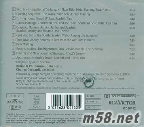 亂世佳人 電影原聲(m58.net) 作為好萊塢歷史上最重要的經(jīng)典影片之一,《亂世佳人》無疑已成為電影史上的一件珍貴瑰寶,數(shù)幾十年來一直是影迷票選中最受歡迎的一部影片。根據(jù)瑪格麗特.米契爾的暢銷名著《飄》(Gone With The Wind)改編而成。 本片的作曲由第一座奧斯卡配樂獎的得主馬克斯.斯坦納(Max Steiner)擔(dān)任。這部史詩巨片長達3小時45分,配樂共發(fā)展出11個主題,99段音樂,其中不少音樂參考了美國民謠之父史蒂文.福斯特采集的南方民謠,其中,女主人翁郝思嘉站在大樹下期盼明天的畫面,配合了雄壯的主題音樂,將"土地不死"的精神發(fā)揮得淋漓盡致。此版本于74年由奧地利國家愛樂交響樂團演奏,RCA Victor唱片公司發(fā)行,89年在紐約用杜比環(huán)繞音效錄制完成。溫馨感人,宏偉瑰麗,氣勢萬千的史詩樂章,絕佳的錄音再一次烙印在影迷的心中。