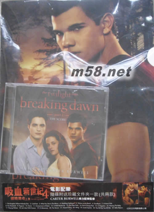暮光之城:破曉I-電影配樂 THE TWILIGHT SAGA: BREAKING DAWN - PART 1-THE SCORE/O.S.T.(m58.net) 史蒂芬妮˙梅爾的吸血鬼浪漫史詩著作【暮光之城】,不僅熱銷了超過1億1600萬本,改編自同名著作的系列電影,更締造了18億美金票房,而一路賣座長紅至今的暮光系列電影,終於在2011年開始步入精彩完結篇【破曉】! 【暮光之城:破曉I】同時也是Carter Burwell與本片導演比爾康頓繼【眾神與野獸】、【金賽性學教室】之后的第三度合作,Carter前往倫敦著名的Abbey Road Studios進行音樂創作與錄製工作,錄音過程中還與分別擔任前兩部配樂的Alexandre Desplat及Howard Shore交換意見。Carter在以柔情似水的鋼琴彈奏與華麗壯闊的交響樂聲為主軸的創作中,輔以清脆的鈴聲、孤單的吉他撥絃聲、悠悠的吹奏樂器聲、洶涌的打擊樂器聲,以及含情脈脈的提琴樂聲,傾全力為本片譜寫出淒美浪漫的愛情交響詩篇,展現了這位生涯多以另類或獨立電影小品見長的電影音樂家,駕馭商業電影大片的非凡本領!