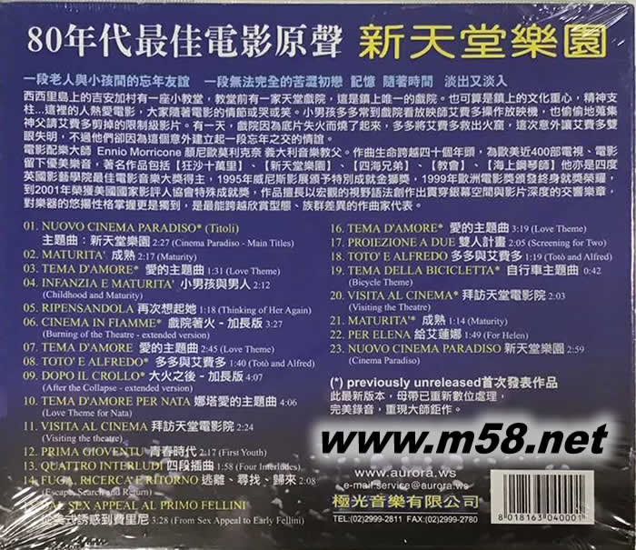 新天堂樂園 電影原聲帶 Nuovo Cinema Paradiso O.S.T.(m58.net) 80年代最佳電影原聲帶 1989年奧斯卡最佳外語片 此最新版本,母帶已重新數位處理,完美錄音,重現大師鉅作。