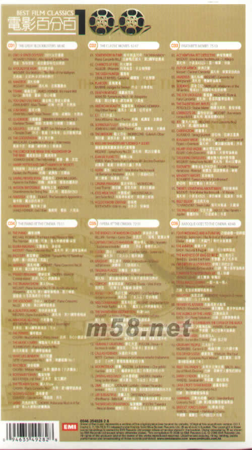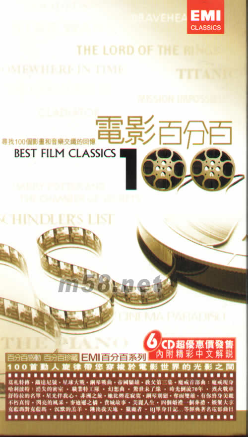 電影百分百套裝(m58.net) EMI唱片 百分百6CD套裝系列有: 1、古典百分百套裝 2、鋼琴百分百套裝 3、歌劇百分百套裝 4、電影百分百套裝 5、莫扎特百分百套裝 6、爵士百分百套裝 7、愛情百分百套裝 6CD超優惠價發售 內附精彩中文解說 百分百感動 百分百珍藏 EMI百分百系列 100首動人旋律帶您穿梭于電影世界的光影之間