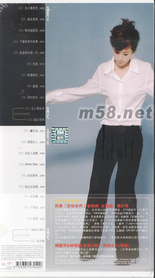 價格為估,以實到貨為準! 屬于我的林憶蓮(m58.net) 全新陳2首新歌 *屬于我ON MY OWN(雨果[悲慘世界]音樂劇主題曲) 公認音樂劇史上最偉大的演出,創下演長達17看歷史紀錄、超過6000余次喝彩,維克多雨果[悲慘世界]音樂劇主題曲 *兩個女人TWO WOMEN (粵語)梅艷芳&林憶蓮 梅艷芳&林憶蓮全球華語歌壇二位天后,破天次攜手合唱,友情之歌。 典藏16首精挑細選好音樂+4首經典好歌紀錄檔案 所有華語音樂頒獎禮一致推見的專輯,2000~2002年最精采: 林憶蓮"S 2001蓮 原來...林憶蓮 全新音樂推見:雨果[悲慘世界]音樂劇 主題曲:屬于我 公認音樂劇史最偉大的演出,全球演出超過35個國家、213個城市、21種不同語言、超過3400場次演出、4900萬觀眾、票房超過18億美元,創下上演長達17年歷久衰歷史新紀錄,百老匯歷史巡演時間第二長劇碼[悲慘世界]。林憶蓮繼2001年受邀參加北京首次,由二十世紀音樂劇大師安德魯偉伯的精華版[安德偉伯音樂盛典],演唱[萬世巨星]一劇中[I DON‘T KNOW HOW TO LOVE HIM ]受到一致激賞;2002年在中國上演的第一部百老匯音樂劇[悲慘世界],特別邀請林憶蓮指定演唱[悲慘世界]主題曲-ON MY OWN 屬于我。 香港超優秀音樂才子黃耀明跨刀參與制作,一首完美古典與現代流行音樂的結合。 梅艷芳&林憶蓮友情之歌:兩個女人(粵語) 千變萬貨的天后梅艷芳加上音樂頂尖的天后林憶蓮,二位華語音樂天后,首次破天荒攜手友情合唱之歌。 至少還有你,遠走高飛,紙飛機《經典好歌紀錄檔案》