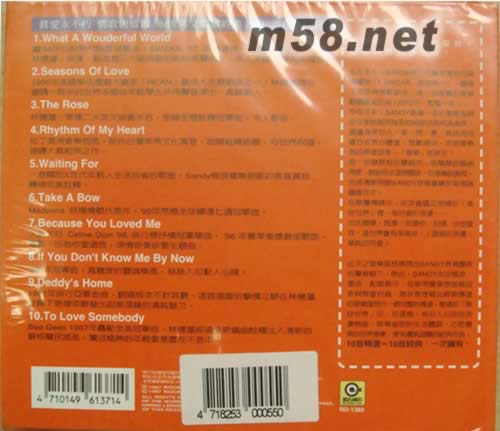 01. What A Wouderful World 繼'96年空前熱門話題冠軍曲I SWEAR,'97年蟬連第一巨獻特選金曲。林憶蓮、齊豫、劉美君三大唱將歌后絕妙美聲組合,再次天籟呈現完美極致。 02. Seasons Of Love 1996年美國東尼獎最大贏家[REAN]最感人主題歌曲之一。林憶蓮特別邀請一群來自世界各國的年輕學生共同聲音演出,真誠動人。 03. The Rose 林憶蓮、齊豫二大英文銷售天后,登峰至極詮釋冠軍曲,令人動容。 04. Rhythm Of My Heart 拉丁美洲音樂曲風,結合臺灣卑南文化寓意,拋開經緯距離,向世界祝福,磅礴大氣經典之作。 05. Waiting For 一首關于X世代年輕人生活自省的歌曲,Sandy展現毫無瑕疵的高音真假轉換完美詮釋。 06. Take A Bow Madonna終極情歌代表作,'95年席卷全球蟬連七周冠軍曲。 07. Because You Loved Me 人氣天后Celine Dion '96排行榜抒情冠軍單曲,'96年葛萊美獎最佳歌曲,電影[因為你愛過我]深情奇美珍愛主題曲。 08. If You Don't Know Me By Now '89年冠軍曲,高難度的靈魂樂風,絲絲入扣動人心魄。 09. Deddy's Home 1961年排行亞軍金曲,翻唱版本不計其數。這首溫暖的摯情之歌在林憶蓮詮釋下更增添散發出甜美溫暖的清純魅力。 10. To Love Somebody Bee Gees 1967年轟動全美冠軍曲,林憶蓮經過全新編曲詮釋注入清新的蘇格蘭民謠風,闡述熾熱的年輕愛意盡在不言中。