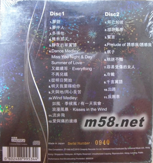 DISC 1 1. 夢游 2. 夢中人 3. 多得他 4. 無奈那天 5. 靜夜的單簧管 6. Dance Medley: Miss You Night & Day/ Summer of Love / 又繼續(xù)等/ Everything/ 不再兒嬉 7. 從明日開始 8. 明天我要嫁給你 9. 天與地(粵)/ 用心良苦(國) 10. Wind Medley: 如風/ 季候風(粵) / 有一天我會(國)/ 浪漫風暴/ Kisses in the Wind 11. 流非飛 12. 愛與痛的邊緣 DISC 2 1. 知己知彼 2. 胡思亂想 3. 誓言 4. Prelude of 誘惑我/誘惑我 5. 棋子 6. 執(zhí)迷不悔 7. 容易受傷的女人 8. 冷戰(zhàn) 9. 千言萬語 10. 出路 11. 我愿意