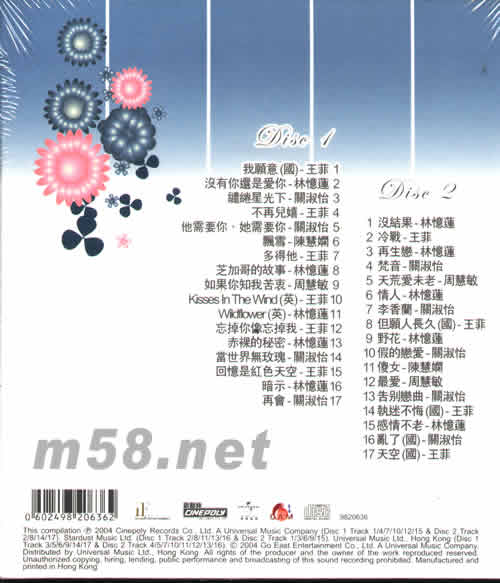 Disc 1 1.我愿意 (國) - 王菲 2.沒有你還是愛你 - 林憶蓮 3.繾綣星光下 - 關淑怡 4.不再兒嬉 - 王菲 5.他需要你,她需要你 - 關淑怡 6.飄雪 - 陳慧嫻 7.多得他 - 王菲 8.芝加哥的故事 - 林憶蓮 9.如果你知我苦衷 - 周慧敏 10.Kisses In The Wind (英) - 王菲 11.Wildflower (英) - 林憶蓮 12.忘掉你像忘掉我 - 王菲 13.赤裸的秘密 - 林憶蓮 14.當世界無玫瑰 - 關淑怡 15.回憶是紅色天空 - 王菲 16.暗示 - 林憶蓮 17.再會 - 關淑怡 Disc 2 1.沒結果 - 林憶蓮 2.冷戰 - 王菲 3.再生戀 - 林憶蓮 4.梵音 - 關淑怡 5.天荒愛未老 - 周慧敏 6.情人 - 林憶蓮 7.李香蘭 - 關淑怡 8.但愿人長久 (國) - 王菲 9.野花 - 林憶蓮 10.假的戀愛 - 關淑怡 11.傻女 - 陳慧嫻 12.最愛 - 周慧敏 13.告別戀曲 - 關淑怡 14.執迷不悔 (國) - 王菲 15.感情不老 - 林憶蓮 16.亂了 (國) - 關淑怡 17.天空 (國) - 王菲