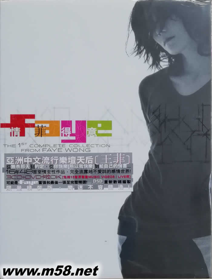 亞洲中文流行樂壇天后 – 王菲 從 無奈那天 到 約定,從 你快樂所以我快樂 到 給自己的情書… 17年 48首 至情至性作品,完全流露她不愛說的感情世界! 情‧菲‧得意3cd 可能是Faye首張和最后一張至完整精選! 特別加送DVD 15首熱唱MUSIC VIDEOS卡拉OK DSD 重新數碼編制!! 限量精裝版,樂迷不容錯過! CD1 01. 無奈那天 02. 借口 03. Everything 04. 巴黎塔尖 05. 又繼續等 06. 多得他 07. 靜夜的單簧管 08. 請勿客氣 -軟硬天師合唱 09. Miss You Night & Day 10. 容易受傷的女人 11. Kisses In The Wind 12. 季候風 13. Summer Of Love 14. 不再兒嬉 15. 執迷不悔 16. 流非飛 CD 2 01. 如風 02. 冷戰 03. 忘掉你像忘掉我 04. Do We Really Care? 05. 我愿意 06. 知己知彼 07. 胡思亂想 08. 誓言 09. 夢中人 10. 愛與痛的邊緣 11. 棋子 12. 出路 13. 天空 14. 非常夏日 - 張學友合唱 15. 但愿人長久 16. 流星 CD 3 01. Di-Dar 02. 曖昧 03. 浮躁 04. 暗涌 05. 約定 06. 你快樂(所以我快樂) (國) 07. 人間 08. 原諒自己 09. 情誡 10. 償還 11. 郵差 12. Eyes on me 13. 給自己的情書 14. 香奈兒 15. 色盲 16. 花生騷 -梅艷芳合唱 KARAOKE DVD 珍藏版 01. 如風 02. 我愿意 03. 棋子 04. 夢游 (LIVE) 05. 明天我要嫁給你 (國) (LIVE) 06. 天與地 (粵)/用心良苦 (國) (LIVE) 07. 千言萬語 (LIVE) 08. Di-Dar 09. 曖昧 10. 暗涌 11. 你快樂(所以我快樂) (國) 12. 人間 (國) 13. 只是陌生人 14. 迷路 (LIVE) 15. 當時的月亮