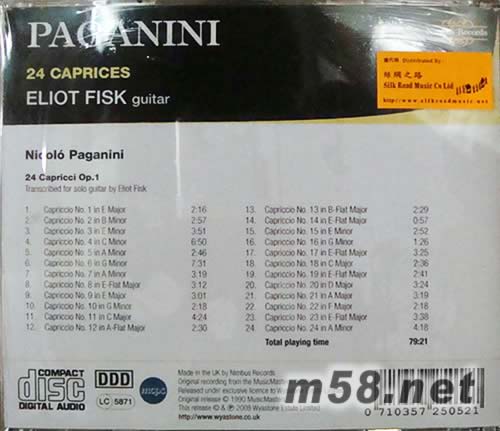 鼎鼎大名的美國古曲吉他演奏家,音樂教育家艾里奧特,菲斯克(ELIOT FISK)是樂界一致高度推崇的古典吉他演奏家,他擁有精湛非凡的吉他造詣,出神入化的演繹技巧,每次演出均令樂迷沉醉于他的吉他弦下.引人入勝!此專輯收錄菲斯克一個最備受贊賞的全新嘗試,由菲斯克親自改編及以吉他獨奏有"小提琴一代宗師"之稱的作曲家帕格尼尼(N.PAGANINI)的代表作[24首隨想曲],以吉他征服了這首偉大的經典作品,創造了這個古典樂曲融合吉他的一個壯舉!