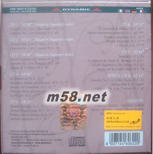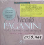 帕格尼尼 全球首套 完整的給小提琴及樂團的作品集 8CD套裝(m58.net) 殿堂級音樂家帕格尼尼(Nicolo Paganini)出生自意大利的熱那亞(Genova),天賦他卓越的音樂才能,自小便得到父親的悉心栽培,結果不負所望,11歲便展開他的音樂生涯,於樂壇嶄露頭角,16歲創作出其絕世作品[24首隨想曲]而一鳴驚人,令他的事業大躍進,成為頂尖的作曲家。全球首次推出帕格尼尼完整的<給小提琴及樂團的作品集>,合共收錄了27首旋律優美、完美工整的作品包括[降E大調第1小提琴協奏曲M.S.21(Violin Concerto No.1 in E flat Major M.S.21)]、[E小調大協奏曲M.S.75(Grand Concerto in E minor M.S.75)]、[女妖之舞M.S.19(La Streghe M.S.19)]、[馬麗亞.露易薩的奏鳴曲(Sonata Maria Luisa)]、[塔朗泰拉舞曲M.S.76(Tarantella M.S.76)]、[中提琴大奏鳴曲M.S.70(Sonata per la Grand Viola M.S.70)]及[拿破侖奏鳴曲M.S.5(Sonata Napoleon)]等,由多位國際著名小提琴家包括阿卡度(Salvatore Accardo)、里奇(Ruggiero Ricci)、梅塞納(Franco Mezzena)、畢安奇(Luigi Alberto Bianchi)、梅紐因(Yehudi Menuhin)及夸亞達(Massimo Quarta)分別配合多個著名樂團合力演繹。讓您更深入認識這位19世紀的音樂巨匠,首次世界發行,絕對是古典愛樂者的必然之選!