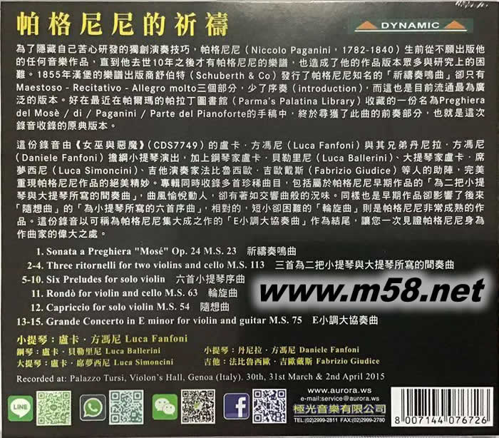 帕格尼尼 重新發(fā)現(xiàn) Paganini Rediscovered(m58.net) Luca Fanfoni (violin)、Luca Ballerini (piano)、 Daniele Fanfoni (violin)、Luca Simoncini (cello)、 Fabrizio Giudice (guitar) 殿堂級音樂家帕格尼尼(Nicolo Paganini)出生自意大利的熱那亞(Genova),天賦他卓越的音樂才能,自小便得到父親的悉心栽培,結(jié)果不負所望,11歲便展開他的音樂生涯,於樂壇嶄露頭角,16歲創(chuàng)作出其絕世作品[24首隨想曲]而一鳴驚人,令他的事業(yè)大躍進,成為頂尖的作曲家。 國際知名的小提琴演奏家路卡.芬霍尼(Luca Fanfoni)肆業(yè)於"米蘭威爾第音樂學院(Giuseppe Verdi Conservatory in Milan)",師承吉捷諾.馬斯特里(Gigino Maestri),曾獲多個國際比賽獎項。芬霍尼在2015年4月於熱那亞(Genova)的多利亞宮小提琴廳(Palazzo Tursi, Violin’s Hall)內(nèi)錄音,伙拍鋼琴家盧卡.巴萊里尼(Luca Ballerini)、小提琴家丹尼爾.芬霍尼(Daniele Fanfoni)、大提琴家盧卡·西蒙奇尼(Luca Simoncini)與及結(jié)他演奏家法布里奇奧.祖迪錫 (Fabrizio Giudice),帶來帕格尼尼以下的作品選: 世界首次以CD載體發(fā)行,包括給小提琴及鋼琴連同重新發(fā)現(xiàn)的序曲版本 1.羅西尼歌劇"摩西"主題變奏曲-摩西的祈禱,作品24,MS23(Sonata a Preghiera : Introduction and Variations on "Dal tuo stellato soglio" from Rossini's Mose in Egitto,Op.24,MS23)