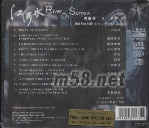 江河水HDCD(m58.net) 江河水 演出:閔惠芬/二胡 古箏/李煒 國樂一向?qū)σ繇懴到y(tǒng)是一種考驗(yàn),音響系統(tǒng)聲音厚度不足者聽起來變成薄薄一片毫無悅耳可言,音響系統(tǒng)解析力夠但感情度詮釋能力不夠,那么聽起來也會變成呆板毫無生氣可言。本片可貴的是錄音非常優(yōu)秀,演奏者的功力之深厚讓這些曲子有著更深一層的意境與感受,有一位很挑剔的發(fā)燒友,聽完本片說道:他從不聽國樂,從不知國樂也可以這么感人....云云。我個人認(rèn)為喜歡國樂的樂友是值得您擁有的專輯,對發(fā)燒友來說,先估且不論本片的錄音效果,如果您是內(nèi)行的音響發(fā)燒友,閔惠芬小姐錄完「江河水」之后,興高采烈的跑出錄音室向友人說道:我超越了自己了!也可以說是一張國樂的傳奇錄音已誕生了! 閔惠芬可以說是又再次突破她以往的成就,這一張專輯無論是錄音的成就或者是樂曲演奏的成就都可以說是國樂的典范,也是里程碑之一。這一張專輯的音樂性真可用FIM老板馬浚先生在本專輯內(nèi)文的序言標(biāo)題--繞梁十日可以形容。本片內(nèi)文的中文解說之中,對本片的錄音以及樂曲解說、演奏者均有非常詳盡的說明,在此也不必再做文抄公了,請樂友們購買以后自行觀看。