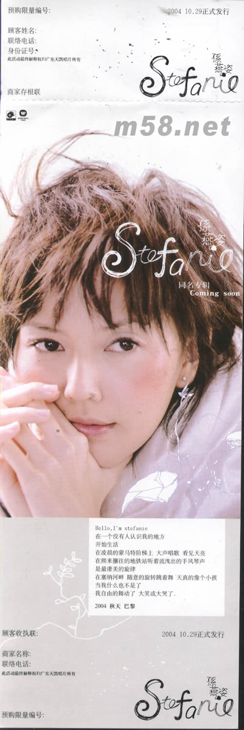 價格為估,以實到貨為準! 同名專輯(預(yù)購限量引進版)(m58.net) 請點看預(yù)購贈品及產(chǎn)品大圖 9首全新單曲+2首年度代言廣告曲 孫燕姿STEFANIE同名專輯2004初登場珍藏預(yù)購禮 首度公開2004最新大碟新曲精華搶聽版 首度分享2004給你的第一封信 紀念掛飾一張,背面為孫燕姿寫給你的信.尺寸為:20.5*16.2CM 粉色信封,尺寸為:17.4*21.5CM 預(yù)購單一張 強力主打 我的愛……完全展現(xiàn)燕姿VOCAL特質(zhì)的美麗情歌 奔……速度感爆發(fā)力十足的混種ROCK強力單曲 感動推薦 我也很想他……電影在世界中心呼喊愛情臺灣中文主題曲 同類……2004最深刻動人的抒情佳作 特別推薦 種……孫燕姿作曲、制作充滿童趣的精彩作品 STEFANIC……孫燕姿首度公開發(fā)表的歌詞創(chuàng)作
