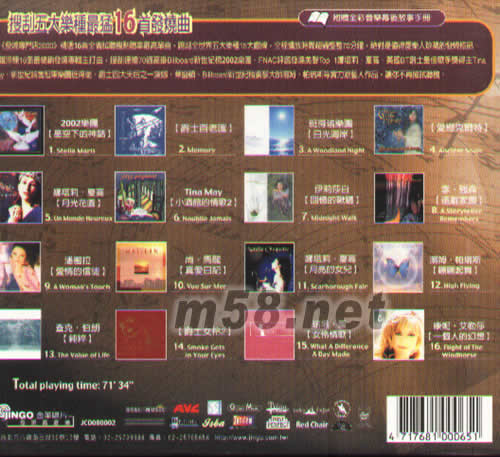 01. Stella Maris 師蒂拉 [蟬聯Billboard超強70周實力派2002樂團最新主打曲] 02. Memory 回憶 [百老匯破紀錄連演7485場音樂劇<貓>主題曲] 03. A Woodland Night 森林中的一夜 [新世紀銷售冠軍班得瑞樂團重編鋼琴經典代表曲] 04. Ancient Souls 古老的靈魂 [克爾特史上最年輕女聲佳百莉融合葛利果圣歌成名曲] 05. Un Monde Heureux 快樂世界 [2000年臺北國際城市藝術節壓軸藝人娜塔莉電視廣告曲] 06. Noublie Jamais 永遠別忘記 [大英國協BT爵士大獎最佳歌手Tina May駐場招牌曲] 07. Midnight Walk 午夜漫步 [南加大鋼琴碩士依莉莎白榮獲國際音樂節首獎創作曲] 08. A Storyteller Remembers 雪洛基長老 [史上氣勢最磅礴交響曲+印地安吟唱民族大和解震撼曲] 09. A Woman's Touch 一夜情 [克爾特美聲潘蜜拉放浪吉普賽風情最受爭議話題曲] 10. Vue Sur Mer 看海 [比利時鋼琴巨匠尚.馬龍奔洩男人柔情高潮曲] 11. Scarborough Fair 畢業生 [娜塔莉全球正宗首唱電影[畢業生]美聲版挑戰曲] 12. High Flying 越飛越高 [Billboard鋼琴大師湯姆.帕瑞斯再登顛峰攻頂曲] 13. The Value of Life 無價 [查克.伯朗精煉20年創作生涯首選雋永傳世曲] 14. Smoke Gets in Your Eyes 你那迷蒙的眼神 [<你是我今生的新娘>、<直到永遠>黛娜華盛頓原唱曲] 15. What a Difference a Day Made 一天的變化有多少 [電影<重慶森林>、<羅拉快跑>主題曲] 16. Flight of the Windhorse 天馬行空 [Billboard成人榜Top 20小提琴才女康妮新作首發曲]