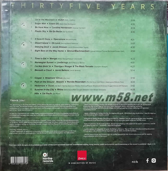 THE DALI 5 LP 達尼試機精選 (5)雙黑膠(m58.net) DALI CD第五集「三十五周年」紀念特輯 喇叭名廠的自我挑戰, 發燒級專屬錄制,DALI CD及LP黑膠唱片第五集正式登場! 廣受音響迷好評的DALI CD即將推出第五集,這次有一個特別的意義,就是今年(2018)也是DALI成立的35周年。往年推出的DALI CD及LP不但是音響迷測試音響的好伙伴,里面所選的音樂也非常廣泛,更成為音響迷選購音樂時候的指南。 這次DALI CD第五集的制作與之前選錄其他專輯樂曲的做法不同,特別邀請丹麥頂尖的藝人與團體重新演唱(演奏),在傳奇的哥本哈根Medley Studios采現場收音的方式錄制,17首各類型音樂全都是專為這張專輯特別錄制。 做為一家喇叭制造商,賣的是音響器材,為什么要出唱片?Dali認為現在市面上充斥著各種經過大量壓縮的音樂,新一代的愛樂者,喜歡聽音樂,卻不清楚什么是高質量錄音。那些經過大量壓縮的音樂檔案,缺少音樂動態,動態范圍甚至壓縮到只剩下10-15dB,最大聲到最小聲間的落差被拉平到僅剩一點,少了該有的起伏,音樂聽起來自然就平淡無趣。事實上,這些音樂若能有完整的動態,只要是用心制作的音樂,都該能夠感動人心。 CD制作一如往常,堪稱非常用心。環保紙盒包裝,手冊內頁資料豐富,不連封面、封底就有26頁,內中闡述了他們對聲音和音樂回放的理念,CD收錄的17個音軌每一曲都有專頁介紹,介紹藝人、介紹歌曲,更詳列所有錄音設備,有的曲目還特別說明了錄音細節。一邊聽,一邊對照手冊,更能感受到Dali的用心。