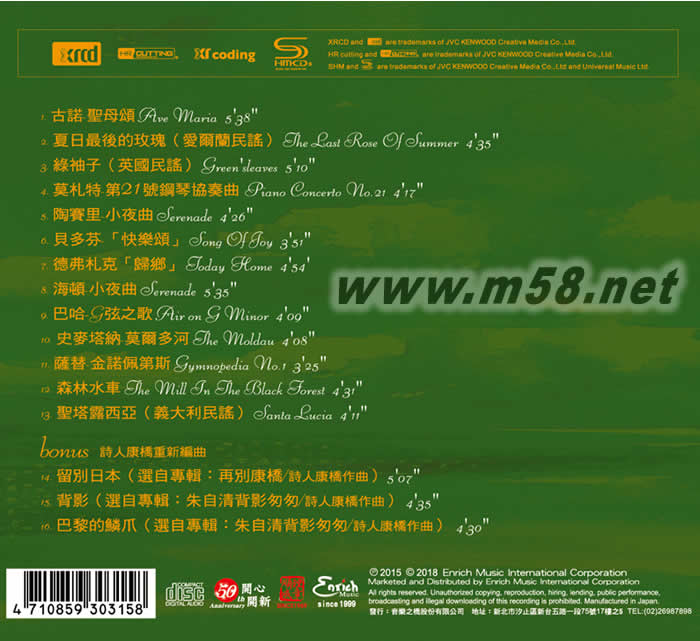 民謠 嚴選薰衣草典藏專輯 New XRCD+SHMCD(m58.net) 大師級評鑒賞識版 發燒級高傳真錄音質量,從拾音、后制到壓片均全面性的低失真要求,樂器演奏細節完整保存,留住了音樂中的靈魂,此碟是要求高品味不容錯過的極高音樂性的佳作。 它是所有發燒友夢寐以求的佳作,也是不發燒羣體啟發音樂心靈之窗。 Made In Japan New XRCD,對母帶素材並無特別要求。即使不是Hi-Bit.Hi-Sampling的母帶素材,只要經過XR cording處理后便立即Up convert,再透過DAW(Digital Audio Workstation)所輸出的數位資料,經由JVC選定的錄音師進行母帶后製工程。 接著,母帶后製工程所完成之Hi-Bit.Hi-Sampling的High-Resolution素材,再透過HR cutting進行Direct cutting(刻盤)。然后,將大幅提升的高透明度、高解析素材,以SHM-CD進行壓片。 經過全部的后製工程,對原母帶音質細節部份的專業處理,重視如同錄音時的相同品質。讓聽眾能夠盡情享受到由歌手、製作人、錄音師們所想要呈現的音樂。 New XRCD能夠在所有的CD Player播放。 SHM-CD (Super High Material CD) 的原料不同於目前的CD,採用的是與液晶面板相同的聚碳酸脂熱可塑性材質。使其更加具有透明性及高音質的CD。 SHM-CD的品質特性 使用高流動行及高轉寫性的材料,使得CD的刻盤可以更加精密細致。 訊號特性更加優越。 所有的CD PLAYER皆可以使用。(不挑CD PLAYER) 平衡度比一般CD更優良。 堅持以高品質為優先的生產流程。 SHM-CD的生產堅持 1. 採用JVC獨自的一體成型工法,高流動性、高轉寫度的新器材應用於CD。 2. 採用最新改良再加上JVC原創的高精細度的模板。 3. 使用全新設備的生產線。 SHM-CD的音質 實現透明感的音質。 解析度大幅進步。 音質的平衡度更優良。 減少偏音感,解除一般CD低音域的不足現象。 大師級評鑑賞識版 **發燒級高傳真錄音品質,從拾音、后製到壓片均全面性的低失真要求,樂器演奏細節完整保存,留住了音樂中的靈魂,此碟是要求高品味不容錯過的極高音樂性的佳作。 你準備好了嗎?一整片紫色的花草香,就在身心鬆弛的一刻,讓你聽見。 你問我:『聽見花草香的芬芳嗎?』站在綿延的薰衣草田里,清新的青草香簇擁著優雅的氣習,我不禁深深地吸了一口氣。『是啊!音符在紫色的花束間跳躍著,輕柔的旋律拂過耳際,彷彿是薰衣草飄逸的裙襬,充滿幸福的香氣撲鼻,空氣開始清凈透明。』