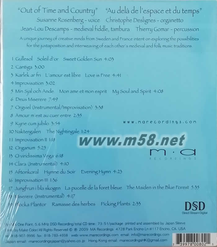 超越時(shí)空 Out of Time & Country(北歐民謠)(m58.net) 蘇珊.羅森伯格 演唱 克里斯多福.戴林 義大利手風(fēng)琴 提耶里.戈馬 打擊 尚.盧.戴康 中古提琴、印度塔姆布拉琴 ★ 北歐民謠風(fēng)格與法國(guó)中古浪漫與印度異國(guó)氣息的奇異邂逅,由法國(guó)與印度樂器跨界詮釋優(yōu)美的瑞典民謠! ★ 製作人陶德葛芬柯以直流供電麥克風(fēng)單點(diǎn)拾音,為您帶來極具空間臨場(chǎng)感與富含美學(xué)氣息的發(fā)燒錄音! M.A Recordings的唱片,每一張皆以特製的直流供電麥克風(fēng)單點(diǎn)拾音,錄音展現(xiàn)逼真的臨場(chǎng)感,專輯幀裝更有著手作藝品的高級(jí)質(zhì)感。更重要的是,M.A製作人陶德葛芬柯以其對(duì)音樂的敏銳度,讓不同類型的演奏家激盪出美侖美奐的音樂火花,極為精彩動(dòng)人! 這張《超越時(shí)空》便是M.A讓人驚艷的又一證明。本專輯融合瑞典民謠與法國(guó)中古樂器,又將法國(guó)中古歌謠譯成瑞典語(yǔ)演唱。演唱者蘇珊羅森伯格是瑞典民謠的專家,深沈神秘的嗓音配上聲響效果獨(dú)特的法國(guó)中古提琴、印度塔姆布拉琴,營(yíng)造出超越時(shí)空的奇妙幻覺,如此超乎想像的跨界組合聽覺竟是如此美妙,絕對(duì)不可錯(cuò)過。