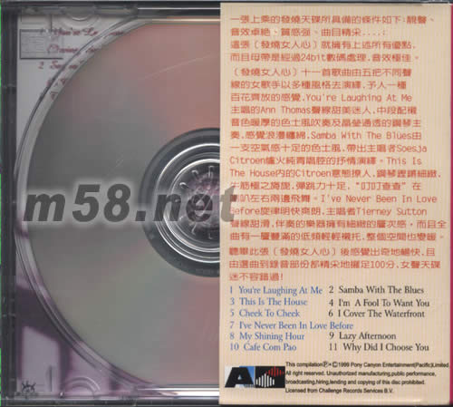 [發燒女人心]十一首歌曲由五把不同聲線的女歌手以多種風格去演釋,予人一種百花齊放的感覺,YOU RE LAUGHING AT ME主唱的ANN YHOMAS聲線甜美迷人,中段配襯音色暖厚的色士風吹奏及晶瑩通透的鋼琴主奏,感覺浪漫纏綿,SAMDA WITH YHE BLUES由一支空氣感十足的色士風,帶出主唱者SOESJA CITROEN爐火純青唱腔的抒情演釋.THIS IS THE HOUSE內的CITROEN意態撩人,鋼琴鏗鏘細致,牛筋極之旖旎,彈跳力十足,"叮叮查查"在喇叭左右兩邊飛舞.I'VE NEVER BEEN IN LOVE BEFORE 旋律明快爽朗,主唱者TIERNEY SUTTON 聲線甜滑,伴奏的樂器擁有細致的層次感,而且全曲有一層豐滿的低頻輕輕襯托,整個空間也變暖.聽畢此張[發燒女人心]后感覺出奇地暢快,且由選曲到錄音部份都精采地擺足100分,女聲天碟迷不容錯過!