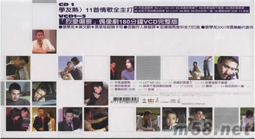 CD1 學(xué)友熱>11首情歌全主打 01. 天氣這么熱 02. LET ME GO 03. 我真的受傷了 04. 如果這都不算愛 05. 想的都是她 06. 結(jié)束不是我要的結(jié)果 07. LOVE 08. 算命 09. 我也和你一樣 10. 看開些吧!女孩 11. 放逐 VCD1-3 [烈愛傷痕]偶像劇180分鐘VCD完整版 *張學(xué)友+莫文蔚+言承旭超強(qiáng)卡司 *名制作人柴智屏+名導(dǎo)演馬宜中全力打造 *張學(xué)友2001年音樂劇代表作