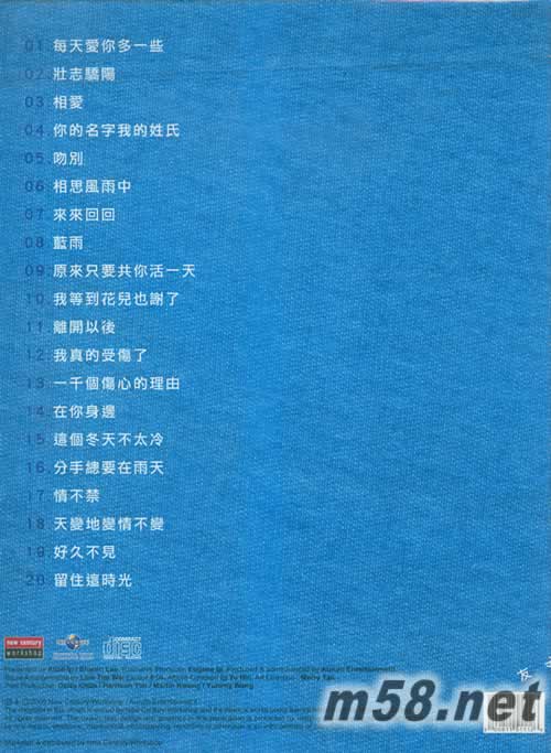 01. 每天愛你多一些 02. 壯志驕陽 03. 相愛 04. 你的名字我的姓氏 05. 吻別 06. 相思風(fēng)雨中 07. 來來回回 08. 藍(lán)雨 09. 原來只要共你活一天 10. 我等到花兒也謝了 11. 離開以后 12. 我真的受傷了 13. 一千個傷心的理由 14. 在你身邊 15. 這個冬天不太冷 16. 分手總要在雨天 17. 情不禁 18. 天邊地變情不變 19. 好久不見 20. 留住這時光