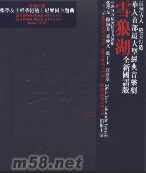 雪狼湖(全新國語版)(m58.net) 特別呈獻 張學友主唱香港迪士尼樂園主題曲 讓奇妙飛翔(廣東版)KTV&MV 讓奇妙飛翔(國語版)KTV &MV Bonus DVD 前無古人 絕美打造 華人首部最大型經典音樂劇 亞洲各方精英傾全力制作 學友的表演和演唱日趨成熟,國語版的演唱聽起來更細膩、感人、富有激情、現場感十足。配樂和錄音皆一流。 張學友飾演胡狼 許慧欣飾演寧靜雪 陳潔儀飾演寧玉鳳