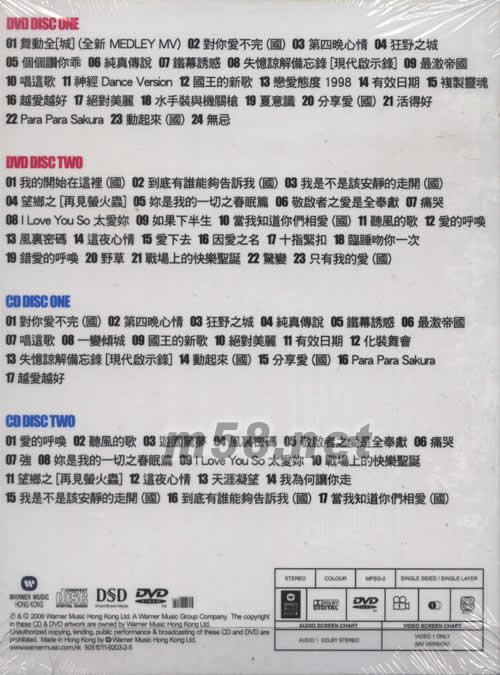 DVD DISC ONE 01. 舞動全[城] (全新MEDLEY MV) 02. 對你愛不完(國) 03. 第四晚心情 04. 狂野之城 05. 個個贊你乖 06. 純真傳說 07. 鐵幕誘惑 08. 失憶諒解備忘錄[現代啟示錄] 09. 最激帝國 10. 唱這歌 11. 神經 12. 國王的新歌 13. 戀愛態度 1998 14. 有效日期 15. 復制靈魂 16. 越愛越好 17. 絕對美麗 18. 水手裝與機關槍 19. 夏意識 20. 分享愛(國) 21. 活得好 22. Para Para Sakura 23. 動起來(國) 24. 無忌 DVD DISC TWO 01. 我的開始在這里(國) 02. 到底有誰能夠告訴我(國) 03. 我是不是該安靜的走開(國) 04. 望鄉之[再見熒火蟲] 05. 你是我的一切之春眠篇 06. 敬啟者之愛是全奉獻 07. 痛哭 08. I Love You So太愛你 09. 如果下半生 10. 當我知道你們相愛(國) 11. 聽風的歌 12. 愛的呼喚 13. 風里密碼 14. 這夜心情 15. 愛下去 16. 因愛之名 17. 十指緊扣 18. 臨睡吻你一次 19. 錯愛的呼喚 20. 野草 21. 戰場上的快樂圣誕 22. 驚變 23. 只有我的愛(國) CD DISC ONE 01. 對你唱不完(國) 02. 第四晚心情 03. 狂野之城 04. 純真傳說 05. 鐵幕誘惑 06. 最激帝國 07. 唱這歌 08. 一變傾城 09. 國王的新歌 10. 絕對美麗 11. 有效日期 12. 化妝舞會 13. 失憶諒解備忘錄[現代啟示錄] 14. 動起來(國0 15. 分享愛(國) 16. Para Para Sakura 17. 越愛越好 CD DISC TWO 01. 愛的呼喚 02. 聽風的歌 03. 游園驚夢 04. 風里密碼 05. 敬啟者之愛是全奉獻 06. 痛哭 07. 強 08. 你是我的一切之春眠篇 09. I Love You So太愛你 10. 戰場上的快樂圣誕 11. 望鄉之[再見熒火蟲] 12. 這夜心情 13. 天涯凝望 14. 我為何讓你走 15. 我是不是該安靜的走開(國) 16. 到底有誰能夠告訴我 (國) 17. 當我知道你們相愛(國)
