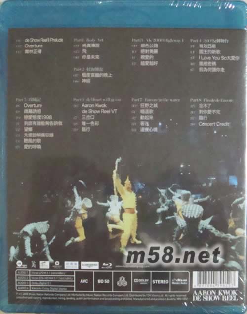 郭富城舞林正傳演唱會 2007 Live + Karaoke(藍光DVD)(m58.net) 碟以系統高清拍攝 至尊級1920x1080高清系統制作 * Sound Mix : - Vocal LPCM 5.1 24bit/48khz - Vocal DTS-HD MA 5.1 24bit/48khz - Dolby Digital 5.1 - Karaoke Dolby Digital Stereo 郭富城繼2004至2005年《舞臺寶典@舞林大匯》和《舞臺寶典@飛越舞林》,奠定了香港舞臺王者的地位,2007年11月翻轉紅館,舉行《舞林正傳演唱會》,延續舞臺王者傳奇。以嶄新的舞臺形象示人,城城又玩體操雙槓表演,把個唱改建為水池和空中360度旋轉舞臺,高唱歷年來首首好歌,如「國王的新歌」、「鐵幕誘惑」、「失憶諒解備忘錄」和「愛的呼喚」,其中旋轉舞臺被列入「世界健力士紀錄」之中,為華人爭光。 城城特別找張叔平構思紅色鉆石新戰衣,甫出場即演繹個唱主題曲「舞林正傳」,大展Hip-hop舞技,之后又以鋼琴自彈自唱「三岔口」、「對你愛不完」和「狂野之城」三首代表作,最后更在安哥部分以水花四濺的舞臺與眾共樂,大唱快歌「個個贊你乖」、「唱這歌」和「臨行」。 此藍光影碟收錄了2007年度《郭富城舞林正傳演唱會》Live + Karaoke,全碟以系統高清拍攝,至尊級1920x1080高清系統制作。