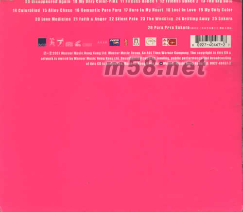 1.越愛(ài)越好 下載 2.活得好(百事2001主題廣告歌) 下載 3.福氣 下載 4.不尋常(Metersborrwe2001主題廣告歌) 下載 5.紅色小夜曲 下載 6.跳舞大王 下載 7.可能不能 下載 8.美麗戰(zhàn)友 下載 9.愈愛(ài)愈好(越愛(ài)越好國(guó)語(yǔ)版) 下載 10.活得好(百事2001主題廣告歌國(guó)語(yǔ)版) 下載 11.不尋常(Metersborrwe廣告歌國(guó)語(yǔ)版) 下載 !@#$% 1.Para Para Sakura(芭啦芭啦櫻之花主題曲) 下載 2.唯一色彩(芭啦芭啦櫻之花插曲) 下載 3.Dance Fight 下載 4.Falling For You 下載 5.Disappeared Again 下載 6.My Only Colour-Pink 下載 7.Fitness Dance 1 下載 8.Fitness Dance 2 下載 9.The Big Date 下載 10.Colorblind 下載 11.Alley Chase 下載 12.Romantic Para Para 下載 13.Here In My Heart 下載 14.Lost In Love 下載 15.My Only Colour 下載 16.Love Medicine 下載 17.Faith & Anger 下載 18.Silent Pain 下載 19.The Wedding 下載 20.Drifting Away 下載 21.Sakura 下載 22.Para Para Sakura(國(guó)語(yǔ))