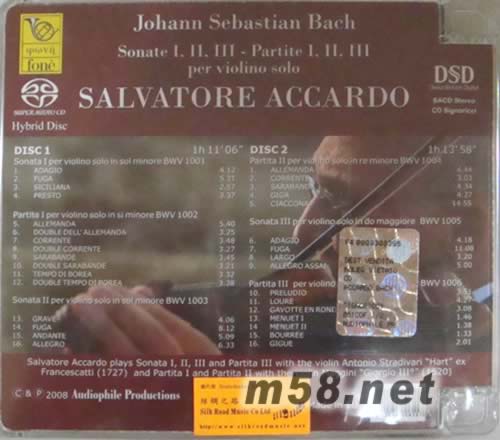 阿卡演奏巴赫的小提琴 SACD(m58.net) 名琴配名家,意大利小提琴一代宗師阿卡多(Salvatore Accardo)分別採(cǎi)用兩部絕世名琴,斯特拉迪瓦里(Antonio Stradivari)於1727年製造之<弗蘭切里卡蒂('Hart'ex Francescatti)>及馬吉尼(Maggini)於1620年製造之<焦?fàn)枂虋W(Giorgio III)>,配合"意大利電影樂(lè)團(tuán)(Orchestra da Camera Italiana)" 合奏出巴哈(J.S.Bach)的[為小提琴獨(dú)奏而作的奏鳴曲(Sonatas for Solo Violin)]全集,與及獨(dú)奏巴哈的[為小提琴獨(dú)奏而作的帕蒂塔(Partitas for Solo Violin)]全集,阿卡多以出神入化的琴技配合最珍貴、極富歷史的名琴將這六首樂(lè)章逐一演繹,弦聲鏗鏘響亮,演奏無(wú)人能及,加上名錄音師里奇(Giulio Cesare Ricci)技術(shù)監(jiān)製,音效無(wú)可比擬,是發(fā)燒古典的頂級(jí)之作。