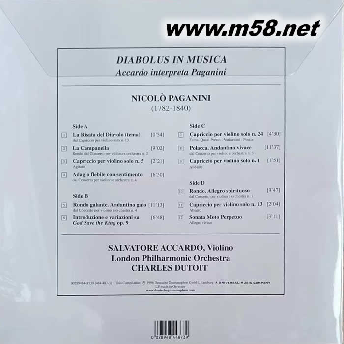 阿卡多演奏 帕格尼尼作品精選Paganini: Diabolus in Musica 魔鬼的顫音 雙黑膠 限量版專輯背面圖片