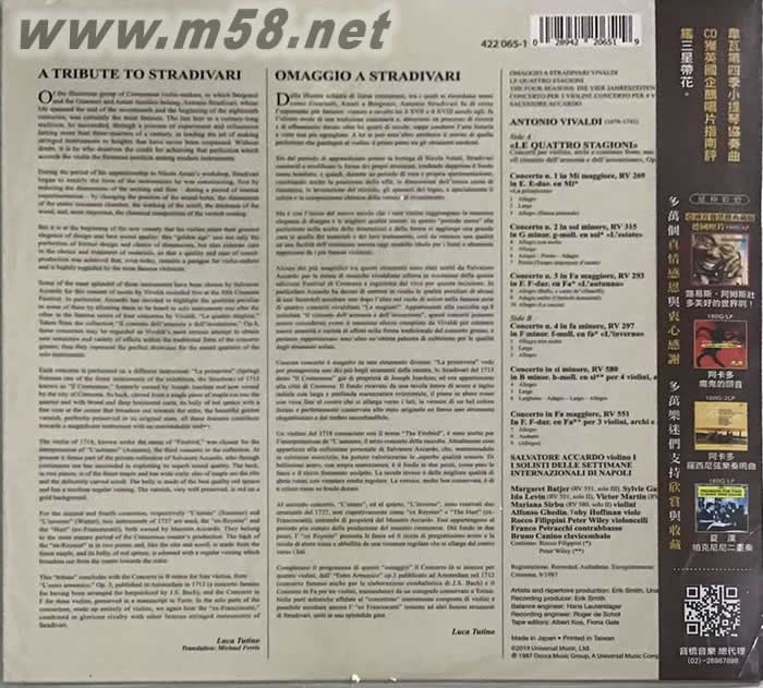 又是一張一代名盤,四季必聽必搜的首選版本,阿卡多用四只史特拉底名琴演奏四季,是發(fā)燒友必 備的一張古典名盤。該碟企鵝評價三星! 阿卡多版音色講究,悠揚,那是一種高貴典雅,灑脫超俗,淋漓盡致的感覺!除第一小提琴之外, 另一個角色起到了至關(guān)重要的作用——羽管鍵琴(布魯諾·卡尼諾)。在許多時候小提琴與羽管鍵琴處 于平等的位置,個別樂句中它甚至單獨發(fā)揮作用;阿卡多版注重音色,這正迎合了“春”的詩句要求。 阿卡多演奏速度偏慢,加之稍強的羽管鍵琴,使人感覺春意融融,暖風拂面,以G弦模擬鳥兒的叫聲靚麗 悅耳;在“夏”的第一、二樂章和“秋”的第二樂章中,作為獨奏家的阿卡多顯示出了強勁的實力,他 右手的運弓力度明顯要超過STANDAGE(平諾克版的第一獨奏小提琴),在情感表達的細膩程度無出其右 。 該CD由特別擅長于室內(nèi)樂的飛利浦[PHILIPS]制作出版,充分保證了一流的CD的音質(zhì)和品質(zhì).