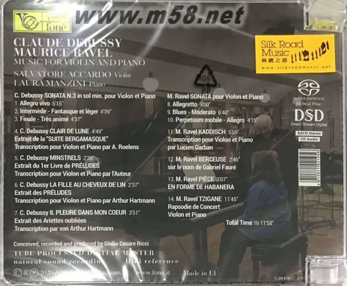 德彪西 拉威爾 小提琴與鋼琴[Claude Debussy - Maurie Ravel : Music for Violin And Piano] SACD(m58.net) Salvatore Accardo (小提琴) Laura Manzini (鋼琴) 1. 意大利小提琴一代宗師阿卡多(Salvatore Accardo)公認(rèn)擁有超凡卓越的琴技,仿如人琴合一般的演奏,猶似行云流水,變化多端,使人著迷。
