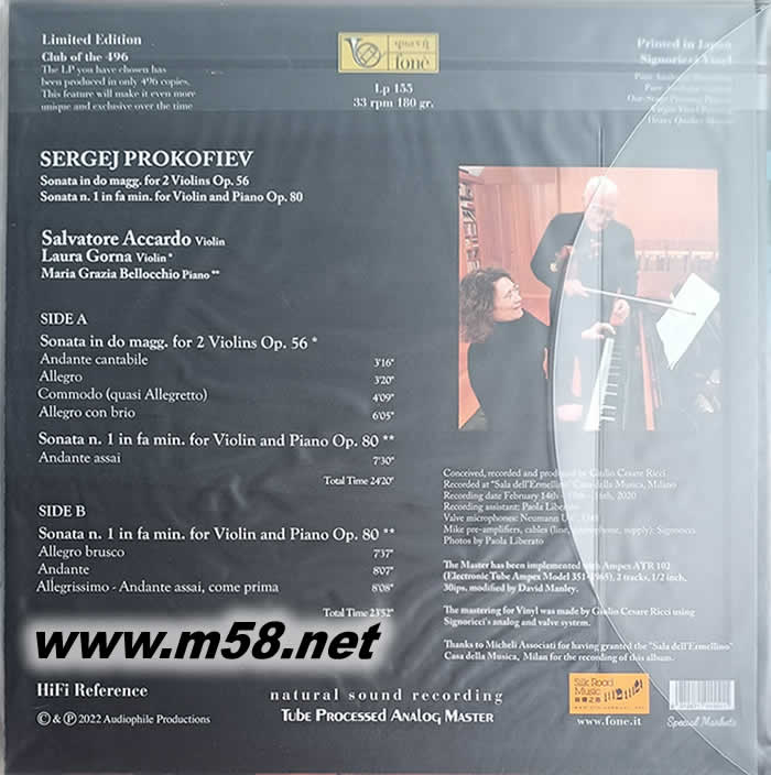 普羅科菲耶夫 小提琴與鋼琴 PROKOFIEV MAURICE RAVEL MUSIC FOR VIOLIN AND PIANO 黑膠 透明膠日本版(m58.net) Salvatore Accardo (小提琴) LAURA GORNA 小提琴 MARIA GRAZIA BELLOCCHIO (鋼琴) 阿卡多《普羅科菲耶夫小提琴奏鳴曲》LP阿卡多與其愛(ài)徒古納共同演繹普羅科菲耶夫不朽經(jīng)典雙小提琴奏鳴曲,與貝洛奇奧合作因目睹戰(zhàn)爭(zhēng)帶來(lái)的殘酷和撕裂感覺(jué)而創(chuàng)作,曲調(diào)陰暗艱澀的第一奏鳴曲。全球限量496張,180克超自然色透明膠唱片,日本壓制!