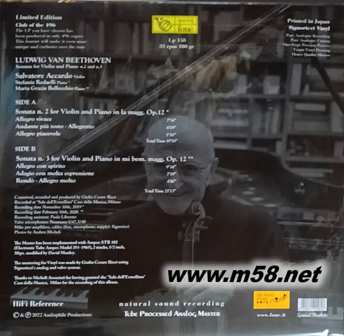 貝多芬給小提琴及鋼琴的第二及三奏鳴曲 BEETHOVEN SONATAS FOR VIOLIN AND IPANO N.2 AND N.3 黑膠 透明膠日本版(m58.net) Salvatore Accardo (小提琴) LAURA GORNA 小提琴 MARIA GRAZIA BELLOCCHIO (鋼琴) 阿卡多《普羅科菲耶夫小提琴奏鳴曲》LP阿卡多與其愛徒古納共同演繹普羅科菲耶夫不朽經(jīng)典雙小提琴奏鳴曲,與貝洛奇奧合作因目睹戰(zhàn)爭帶來的殘酷和撕裂感覺而創(chuàng)作,曲調(diào)陰暗艱澀的第一奏鳴曲。全球限量496張,180克超自然色透明膠唱片,日本壓制!
