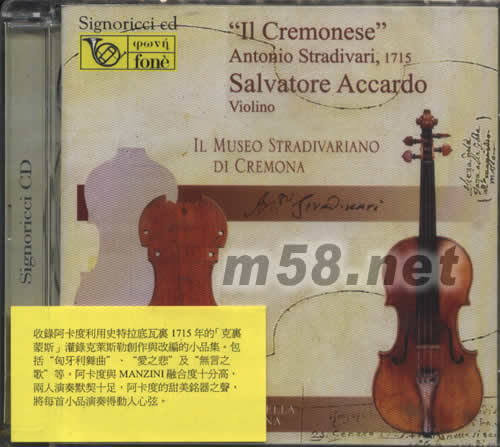 STRADIVARI II CREMONESE阿卡度克里蒙斯(m58.net) 收錄阿卡度利用史特拉底瓦裹1715年的[克裹蒙斯]灌錄克萊斯勒創作與改編的小品集。包括“匈牙利舞曲”、“愛之悲”及“無言之歌”等。阿卡度與MANZINI融合度十分高,兩人演奏默契十足,阿卡度的甜美銘器之聲,將每首小品演奏得動人心弦。