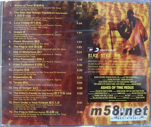 01. Ashes of Time 東邪西毒 (cello solo by Yo-Yo Ma) 02. The Rain Star Brings Trouble (Wu Tong Version) 土黃用事 吳彤版 03. Love Theme 醉生夢死 (cello solo by Yo-Yo Ma) 04. Dream 夢 (cello solo by Yo-Yo Ma) 05. Peach Blossom 桃花 06. The Flag is Still 旗未動 07. Day of Misfortune 破日 08. Killer Formation I 殺陣之一 09. Killer Formation II 殺陣之二 10. Jingzhe 驚蟄 (cello solo by Yo-Yo Ma) 11. Expectation 癡 12. Tangle 糾結 13. Day of Danger 危日 14. The Killer's Career (Wu Tong Version) 殺手生涯 吳彤版 (cello solo by Yo-Yo Ma) 15. Born Under a Total Eclipse 孤星入命 (cello solo by Yo-Yo Ma) 16. The Flag is Still (full version) 旗未動 長版 (cello solo by Yo-Yo Ma)