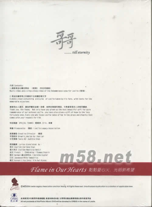 價格為估,以實到貨為準(zhǔn)! 哥哥……till eternity(紀(jì)念相冊珍藏版)(m58.net) IN FOUND MEMORIES OF LESLIE謹(jǐn)以此相冊及DVD紀(jì)念我們永遠(yuǎn)的哥哥:張國榮 此相冊及DVD將用作慈善義賣,收益扣除成本后,以哥哥名義全數(shù)發(fā)捐奧比斯作球盲用途 特別鳴謝SPECIAL THANKS:拿拿淋,ERIC,家豪 策劃PRODUCED BY:晴朗/LESLIE LEGACY ASSOCIATION 創(chuàng)意總監(jiān)CREATIVE DIRECTOR:晴朗 平面設(shè)計CRAPHIC DESIGN BY:KEN LAN 文字撰寫TEXTS BY :JUDITTE CHEN 歌詞翻譯LYRICS TRANS LATED BY: 英文ENGLISH:CORINNA CHAN 意大利文ITALIAN:NADIA GUIDETTI 法文FRENCH:CHAN WING /THOMAS PODVIN 德文GERMAN:貪心的耳朵/DOROTHE KUGLER 日文JAPANESE:MIHO YAMASHITA 韓文KOREAN:LISA ZENG/KIM KWI-KYONG