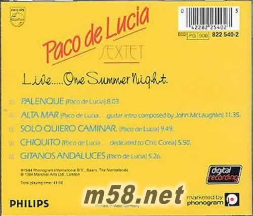 價格為估,以實到貨為準! Live... One Summer Night -The Paco De Lucia Sextet 美版(m58.net) The Paco De Lucia Sextet-《Live... One Summer Night》帕哥德路西亞六重奏現場一個夏天的夜晚 Composers: Artist(s): The Paco De Lucia Sextet Label: (P) 1984 Universal International Music B.V.