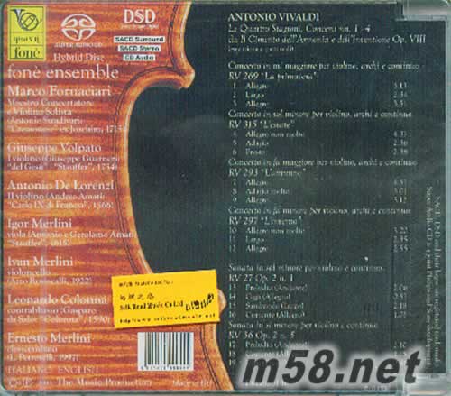 1. RV269 \'La primavera\'--Allegro 2. RV269 "La primavera"--Largo 3. RV269 \'La primavera\'--Allegro 4. RV315\'L\'estate\'----Allegro non molto 5. RV315\'L\'estate\'----Adaigio 6. RV315\'L\'estate\'----Presto 7. RV293\'L\'autunno\'--Allegro 8. RV293\'L\'autunno\'--Adagio molto 9. RV293\'L\'autunno\'--Allegro 10. RV297\'L\'inverno\'--Allegro non molto 11. RV297\'L\'inverno\'--Largo 12. RV297\'L\'inverno\'--Allegro 13. RV27 Op. 2 n.1--Preludio(Andante) 14. RV27 Op. 2 n.1--Giga(Allegro) 15. RV27 Op. 2 n.1--Sarabanda(Largo) 16. RV27 Op. 2 n.1--Corrente(Allegro) 17. RV36 Op. 2 n.5--Preludio(Andante) 18. RV36 Op. 2 n. 5--Corrente(Allegro) 19. RV36 Op. 2 n.5--Giga (Presto)