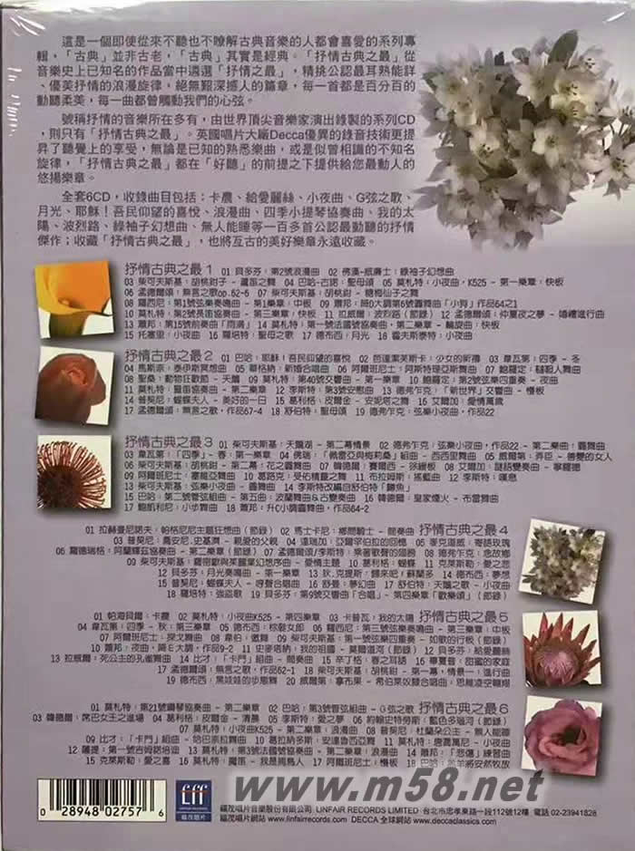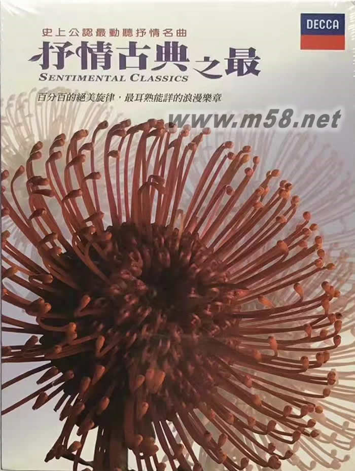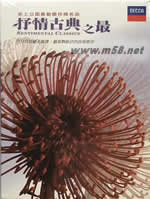 Sentimental Classics 抒情古典之最(6CD套裝)(m58.net) 這是一個即使從來不聽也不瞭解古典音樂的人都會喜愛的系列專輯,「古典」並非古老,「古典」其實是經典。「抒情古典之最」從音樂史上已知名的作品當中遴選「抒情之最」,精挑公認最耳熟能詳、優美抒情的浪漫旋律,絕無艱深撼人的篇章,每一首都是百分百的動聽柔美,每一曲都曾觸動我們的心弦。 號稱抒情的音樂所在多有,由世界頂尖音樂家演出錄製的系列CD,則只有「抒情古典之最」。英國唱片大廠Decca優異的錄音技術更提昇了聽覺上的享受,無論是已知的熟悉樂曲,或是似曾相識的不知名旋律,「抒情古典之最」都在「好聽」的前提之下提供給您最動人的悠揚樂章。 全套6CD,收錄曲目包括:卡農、給愛麗絲、小夜曲、G弦之歌、月光、耶穌!吾民仰望的喜悅、浪漫曲、四季小提琴協奏曲、我的太陽、波烈路、綠袖子幻想曲、無人能睡等一百多首公認最動聽的抒情杰作;收藏「抒情古典之最」,也將亙古的美好樂章永遠收藏。