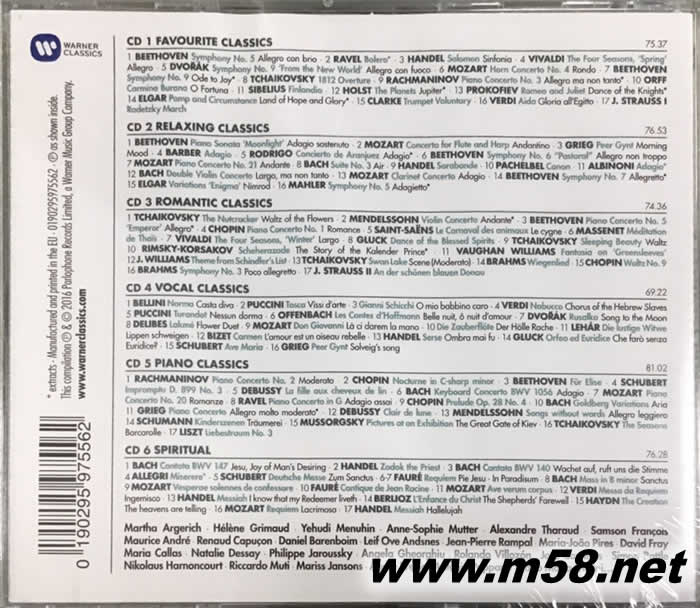 CD1 古典最愛 1. 貝多芬:第5號交響曲,第1樂章 2. 拉威爾:波麗露 3. 韓德爾:席巴女王的進場,選自《所羅門》 4. 韋瓦第:《四季》小提琴協奏曲,春,第1樂章 5. 德弗札克:第9號交響曲《新世界》,第4樂章 6. 莫札特:第4號法國號協奏曲,第3樂章 7. 貝多芬:第9號交響曲,第4樂章《歡樂頌》(節錄) 8. 柴可夫斯基:《1812》序曲 9. 拉赫曼尼諾夫:第3號鋼琴協奏曲,第1樂章 10. 奧夫:噢,命運,選自《布蘭詩歌》 11. 西貝流士:芬蘭頌 12. 霍爾斯特:木星,選自《行星組曲》 13. 普羅高菲夫:騎士之舞,選自《羅密歐與茱麗葉》 14. 艾爾加:威風凜凜進行曲 15. 克拉克:小號志愿軍 16. 威爾第:榮耀歸予埃及,選自《阿依達》 17. 老約翰‧史特勞斯:拉黛斯基進行曲,作品228 CD2 古典抒壓 1. 貝多芬:第14號鋼琴奏鳴曲「月光」,第1樂章 2. 莫札特:長笛與豎琴協奏曲,第二樂章 3. 葛利格:清晨,選自《皮爾金組曲》 4. 巴伯:弦樂慢板 5. 羅德利果:阿蘭輝茲協奏曲,第2樂章(節錄) 6. 貝多芬:第6號交響曲「田園」,第5樂章 7. 莫札特:第21號鋼琴協奏曲,第2樂章 8. 巴哈:第3號管弦組曲,G弦之歌 9. 韓德爾:薩拉邦德 10. 帕爾貝爾:卡農 11. 阿比諾尼:慢板 12. 巴哈:雙小提琴協奏曲,第2樂章 13. 莫札特:單簧管協奏曲,第2樂章 14. 貝多芬:第7號交響曲,第2樂章 15. 艾爾加:寧祿,選自「謎」主題變奏曲 16. 馬勒:第五號交響曲,第四樂章 CD3 古典浪漫 1. 柴可夫斯基:花之圓舞曲,選自《胡桃鉗》 2. 孟德爾頌:小提琴協奏曲,第2樂章 3. 貝多芬:第5號鋼琴協奏曲《皇帝》,第2樂章 4. 蕭邦:第一號鋼琴協奏曲,第二樂章 5. 圣桑:天鵝,選自《動物狂歡節》 6. 馬斯奈:泰伊絲綺想曲 7. 韋瓦第:《四季》小提琴協奏曲,冬,第2樂章 8. 葛路克:受佑精靈之舞 9. 柴可夫斯基:圓舞曲,選自《睡美人》 10. 林姆斯基-高沙可夫:卡蘭達王子,選自《天方夜譚》 11. 佛漢威連士:綠袖子 12. 約翰‧威廉斯:辛德勒的名單 13. 柴可夫斯基:場景,選自《天鵝湖》 14. 布拉姆斯:搖籃曲 15. 蕭邦:第9號圓舞曲 16. 布拉姆斯:第三號交響曲,第三樂章 17. 小約翰‧史特勞斯:藍色多瑙河 CD4 古典歌聲 1. 貝里尼:圣潔的女神,選自《諾瑪》 2. 普契尼:為藝術而生,選自《托絲卡》 3. 普契尼:親愛的爸爸,選自《強尼史基基》 4. 威爾第:奴隸大合唱,選自《納布果》 5. 普契尼:無人能睡,選自《杜蘭朵》 6. 奧芬巴哈:船歌,選自《霍夫曼的故事》 7. 德弗札克:月之頌,選自《魯莎卡》 8. 德利伯:花之二重唱,選自《拉克美》 9. 莫札特:讓我們手牽著手,選自《唐喬望尼》 10. 莫札特:我的心燃燒著地獄般的仇恨,選自《魔笛》 11. 雷哈爾:緊閉的雙唇,選自《風流寡婦》 12. 比才:在圣殿的深處,選自《採珠人》 13. 韓德爾:溫柔的樹叢、懷念的樹蔭,選自《塞爾斯》 14. 葛路克:沒有尤莉迪絲的愛,選自《奧菲歐》 15. 舒伯特:圣母頌 16. 葛利格:蘇爾微格之歌,選自《皮爾金》 CD5 古典鋼琴 1. 拉赫曼尼諾夫:第2號鋼琴協奏曲,第2樂章 2. 蕭邦:升C小調夜曲 3. 貝多芬:給愛麗絲 4. 舒伯特:即興曲90/3 5. 德布西:棕髮少女 6. 巴哈:F小調鋼琴協奏曲 BWV 1056,第2樂章 7. 莫札特:第20號鋼琴協奏曲,第2樂章 8. 拉威爾:G大調鋼琴協奏曲,第2樂章 9. 蕭邦:前奏曲,作品28,第4號 10. 巴哈:郭德堡變奏曲,曲調 11. 葛利格:鋼琴協奏曲,第1樂章(節錄) 12. 德布西:月光 13. 孟德爾頌:輕巧的快板,選自《無言歌》 14. 舒曼:夢幻曲,選自《兒時情景》 15. 穆索斯基:基輔城門,選自《展覽會之畫》 16. 柴可夫斯基:船歌,選自《四季》 17. 李斯特:愛之夢,第3號 CD6 心靈古典 1. 巴哈:耶穌,吾民仰望之喜悅 2. 韓德爾:加冕頌歌 3. 巴哈:醒來吧 4. 阿雷格里:求主垂憐 5. 舒伯特:為圣詠經,選自《德文彌撒曲》 6. 佛瑞:慈悲的耶穌,選自《安魂曲》 7. 佛瑞:在天國,選自《安魂曲》 8. 巴哈:垂憐經,選自《B小調彌撒》 9. 莫札特:證圣者莊嚴的晚禱 10. 佛瑞:尚‧拉辛的讚美之歌 11. 莫札特:圣體頌 12. 威爾第:我罪極深,選自《安魂彌撒》 13. 韓德爾:我知道我的救世主還活著,選自《彌賽亞》 14. 白遼士:牧羊人的告別,選自《基督的童年》 15. 海頓:諸天同述說,選自《創世紀》 16. 莫札特:以淚洗面,選自《安魂曲》 17. 韓德爾:哈雷路亞,選自《彌賽亞》