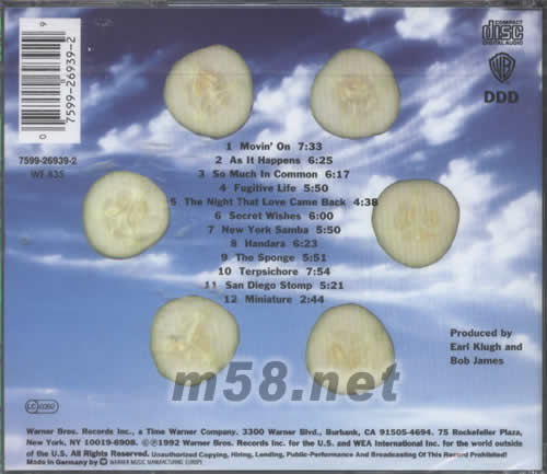1、MOVIN'ON 2、AS IT HAPPENS 3、SO MUCH IN COMMON 4、FUGITIVE LIFE 5、THE NIGHT THAT LOVE CAME BACK 6、SECRET WISHES 7、NEW YORK SAMBA 8、HANDARA 9、THE SPONGE 10、TERPSICHORE 11、SAN DIEGO STOMP 12、MINIATURE