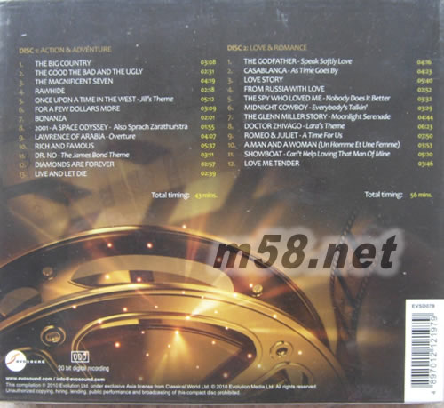 DISK 2 CD 1. THE GODFATHER - Speak Softly Love 2. CASABLANCA - As Time Goes By 3. LOVE STORY 4. FROM RUSSIA WITH LOVE 5. THE SPY WHO LOVED ME - Nobody Does It Better 6. MIDNIGHT COWBOY - Everybody`s Talkin` 7. THE GLENN MILLER STORY - Moonlight Serenade 8. DOCTOR ZHIVAGO - Lara’s Theme 9. ROMEO & JULIET - A Time For Us 10. A MAN AND A WOMAN (Un Homme Et Une Femme) 11. SHOWBOAT - Can`t Help Loving That Man Of Mine 12. LOVE ME TENDER