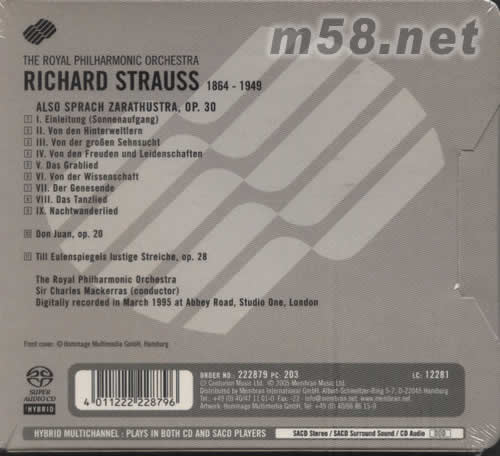1.I. Einleitung(Sonnenaufgang) 2.II. Von den Hinterweltlern 3.III. Von der groben Sehnsucht 4.IV.Von den Freuden und Leidenschaften 5.V. Das Grablied 6.VI. Von der Wissenschaft 7.VII. Der Genesende 8.VIII. Das Tanzlied 9.IX. Nachtwanderlied 10.Don Juan 11.Till Eulenspiegels lustige Stre iche op.28