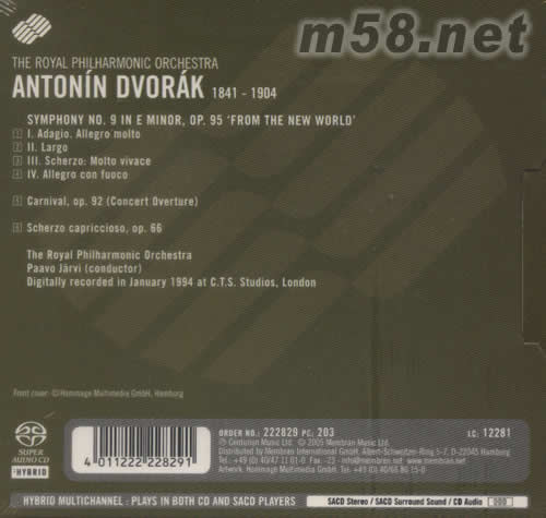 ANTONIN DVORAK1841-1904 SYMPHONY NO.9 IN E MINOR,OP.95"FROM THE NEW WORLD" 1.I. Adagio.Allero molto 2.II. Largo 3.III. Scherzo:Molto vivace 4.IV. Allegro con fuoco 5.Carnival,op.92(Concert Overture) 6.Scherzo capriccioso,op.66 The Royal Philharmonic Orchestra Paavo jarvi(conductor) Digitally recorded in january 1994 at C.T.S. studios London