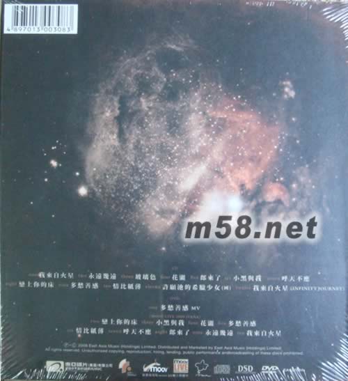 CD 01. 我來自火星 (New) 02. 永遠(yuǎn)幾遠(yuǎn) (New) 03. 玻璃色 (New) 04. 花灑 (古巨基) 05. 狼來了 (楊千嬅) 06. 小黑與我 (薜凱琪) 07. 呼天不應(yīng) (容祖兒) 08. 戀上你的床 (鄭秀文) 09. 多愁善感 (劉德華) 10. 情比紙薄 (李克勤) 11. 許愿池的希臘少女 (國語-蔡依琳) 12. 我來自火星 (Infinity Journey Mix) DVD 01. 多愁善感 MV Moov Live 2008 ivana 02. 戀上你的床 03. 小黑與我 04. 花灑 05. 多愁善感 06. 情比紙薄 07. 呼天不應(yīng) 08. 郎來了 09. 永遠(yuǎn)幾遠(yuǎn) 10. 我來自火星