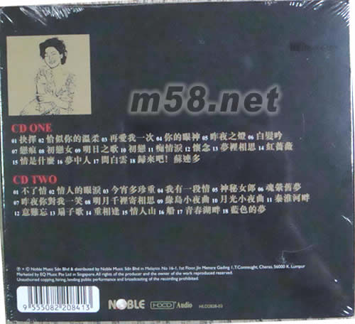 CD ONE 01. 抉擇 02. 恰似你的溫柔 03. 再愛我一次 04. 你的眼神 05. 昨夜之燈 06. 白發(fā)吟 07. 戀痕 08. 初戀女 09. 明日之歌 10. 初戀 11. 癡情淚 12. 懷念 13. 夢里相思 14. 紅薔薇 15. 情是什么 16. 夢中人 17. 問白云 18. 歸來吧!蘇連多 CD TWO 01. 不了情 02. 情人節(jié)的眼淚 03. 今宵多珍重 04. 我有一段情 05. 神秘女郎 06. 魂縈舊夢 07. 昨夜你對我一笑 08. 明月千里寄相思 09. 綠島小夜曲 10. 月光小夜曲 11. 秦淮河畔 12. 意難忘 13. 扇子歌 14. 重相逢 15. 情人山 16. 船 17. 青春湖畔 18. 藍(lán)色的夢