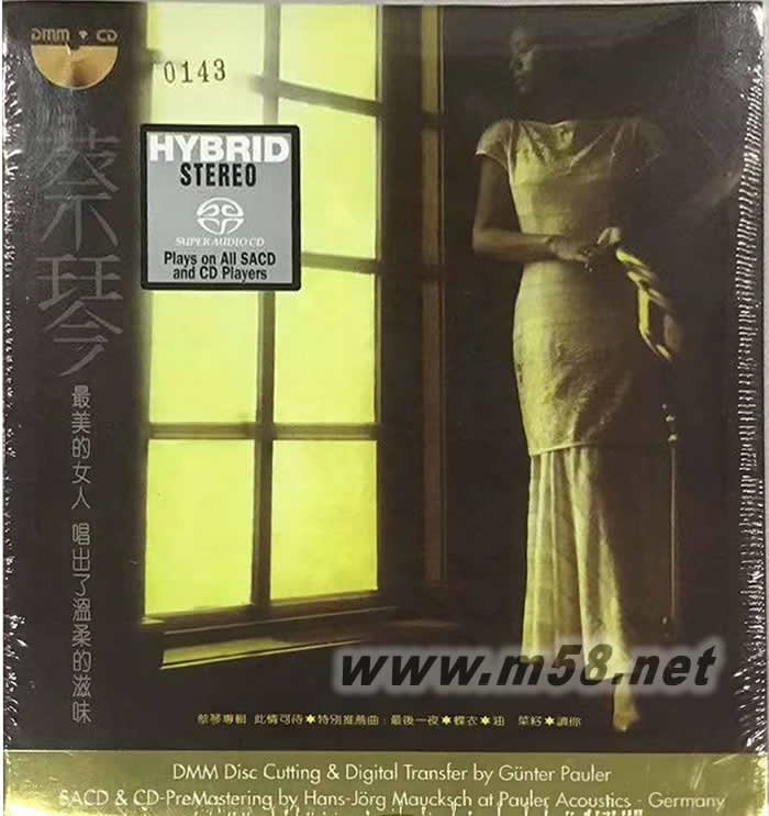 此情可待 蔡琴 DMMSACD 限量版(m58.net) DMM-CD / SACD Direct Metal Master - CD / SACD,是<<老虎魚>> (Stockfisch Records) 經過長期的考究和試驗,工程師將製作黑膠唱片時所採用的金屬直刻母盤(DMM)中的模擬音源完整地轉載到製作CD / SACD的母盤,然后用以壓製成 DMM-CD / SACD 光盤。 黑膠唱片在壓片和重播過程中會產生很多負面的影響,如失真、震盪、底噪、唱針擺動、「炒豆聲」等不利於製造良好音色的聲音缺陷。DMM-CD / SACD 能完全將上述的所有弊端根除,同時仍然保持著黑膠唱片的原有音色。因此,在聆聽 DMM-CD / SACD 時,你能在數碼器材領域中享受到最接近原始黑膠音色的模擬音源。 蓋 印 編 號 Manufactured in Austria