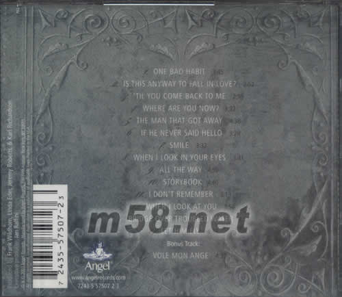 1、ONE BAD HABIT 2、IS THIS ANYWAY TO FALL IN LOVE? 3、TIL YOU COME BACK TO ME 4、WHERE ARE YOU NOW? 5、THE MAN THAT GOT AWAY 6、IF HE NEVER SAID HELLO 7、SMILE 8、WHEN I LOOK IN YOUR EYES 9、ALL THE WAY 10、STORYBOOK 11、I DON'T REMEMBER 12、WHEN I LOOK AT YOU 13、BRIDGE OVER TROUBLED WATER 14、LET HIM FLY 15、VOLE MON ANGE