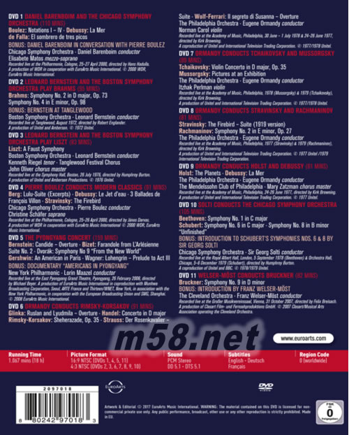 • The top five American orchestras combined in one box: Boston Symphony Orchestra, Chicago Symphony Orchestra, New York Philharmonic, The Cleveland Orchestra, The Philadelphia Orchestra • Including the New York Philharmonic’s legendary 2008 concert performance in North Korea’s capital Pyongyang and many other classic performances • Featuring legendary conductors: Leonard Bernstein, Pierre Boulez, Eugen Ormandi, Sir Georg Solti, Daniel Barenboim, Lorin Maazel, Franz Welser-Möst • World class soloists: Norman Carol, Elisabete Matos, Itzhak Perlman, Kenneth Riegel, Christine Schäfer • With works by: Beethoven, Berg, Bernstein, Bizet, Boulez, Brahms, Bruckner, Carli, de Falla, Debussy, Dvorák, Gershwin, Glinka, Handel, Holst, Liszt, Mussorgsky, Rachmaninov, Rimsky-Korsakov, Schubert, Strauss, Stravinsky, Tchaikovsky, Wagner, Wolf-Ferrari