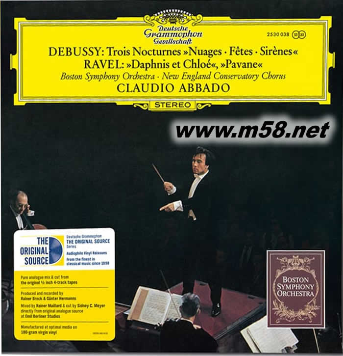 在其125歲生日之際,Deutsche Grammophon將發行具有最高聲音標準的傳奇唱片:新的發燒友黑膠唱片系列The Original Source以全新的音質呈現了20世紀70年代的杰出唱片。為此,著名的Emil Berliner工作室使用專門為制作該系列而開發的技術,以100%模擬質量(AAA)重新制作和編輯了最初的四軌磁帶。與原始版本的聲音差異是相當大的:更高的清晰度、更微妙的細節和頻率響應的改進,同時更少的背景噪音、失真和壓縮,為發燒友帶來前所未有的聆聽體驗。 該系列以180克黑膠唱片和帶原創封面和歌詞的豪華折疊版發行,限量發行并編號。它們還附有錄音日志和磁帶盒的額外照片和傳真,以及一篇解釋確切技術背景的文章。 1970年2月,克勞迪奧·阿巴多和波士頓交響樂團進行了兩次演出,然后錄制團隊的錄音已經準備就緒。他們對德彪西的Trois夜曲、Ravel的組曲Daphnis et Chloé和他的Pavane pour une infante défunte的演繹很快成為經典。