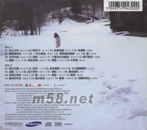 Disc 1 01. 好心分手 -盧巧音 02. 野孩子 -楊千嬅 03. 終身美麗 -鄭秀文 04. 有福氣 -陳慧琳 05. 讓我跟你走 -彭羚 06. 一切也愿意 -關淑怡 07. 愛與痛的邊緣 -王菲 08. 愛 -莫文蔚 09. 任何天氣 -張柏芝 10. 問候 -黎瑞恩 11. 不會哭于你面前 -楊采妮 12. 無可奉告 -何嘉麗 13. 絕戀 -蔡立兒 14. 深夜港灣 -甄楚倩 15. 偶遇 -林志美 16. 午夜情 -劉美君 Disc 2 01. 飛女正傳 -楊千嬅 02. 約定 -王菲 03. 終身學習 -鄭融 04. 分分鐘需要你 -莫文蔚 05. 深藍 -盧巧音 06. 舍不得你 -鄭秀文 07. 爛泥 -彭羚 08. 愛你愛到 -李玟 09. 活得比你好 -李蕙敏 10. 絕 -傅珮嘉 11. 棉胎 -張柏芝 12. 牽掛 -陳松齡 13. 緣份的天空 -湯寶如 14. 細水長流 -蔡齡齡 15. 激情 -林憶蓮 16. 但愿你明白 -楊采妮